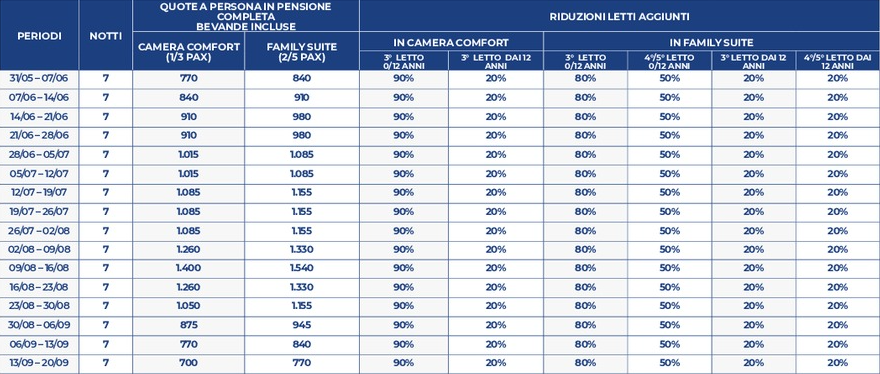 Le tariffe non comprendono eventuali promozioni da verificare al momento della prenotazione. Le tariffe riportate potrebbero non comprendere polizze assicurative integrative, adeguamento carburante (ove i trasferimenti fossero inclusi), eventuali tessere iscrizione, tasse, pulizie, consumi, ecc.; in tal senso è possibile richiedere accesso a listino dettagliato via mail, scrivendo a: numerouno@