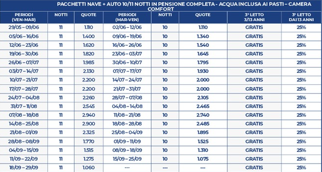 Quota individuale* Quota individuale* PACCHETTI CON NAVE + AUTO O IN SOLO SOGGIORNO - 10/11 NOTTI IN PENSIONE COMPLETA - BEVANDE INCLUSE IN CAMERA COMFORT