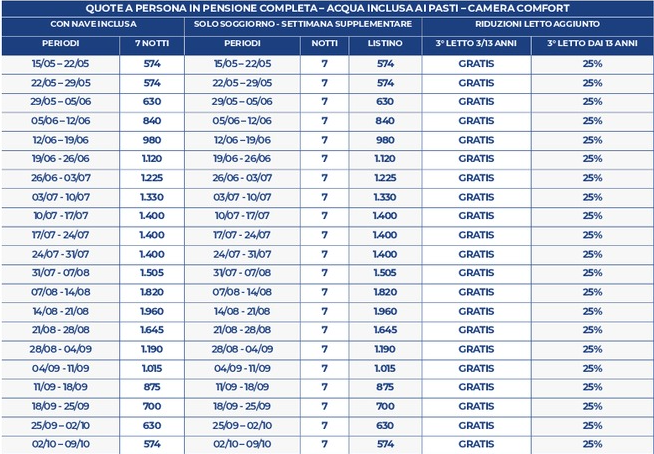 NON DISPONIBILI ALLE SUDDETTE TARIFFE partenze comprese dal 05/08/26 sera al 21/08/2026 sera (sarà comunque possibile prenotarle con una quotazione ad hoc).