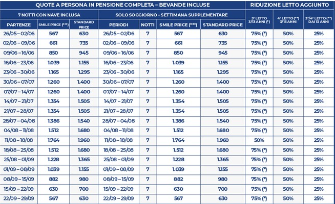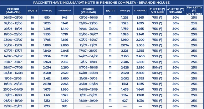 NON DISPONIBILI ALLE SUDDETTE TARIFFE partenze comprese dal 05/08/26 sera al 21/08/2026 sera (sarà comunque possibile prenotarle con una quotazione ad hoc).