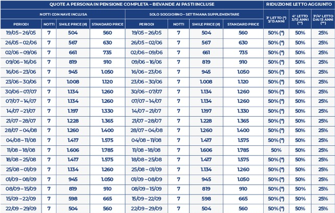 NON DISPONIBILI ALLE SUDDETTE TARIFFE partenze comprese dal 05/08/26 sera al 21/08/2026 sera (sarà comunque possibile prenotarle con una quotazione ad hoc).