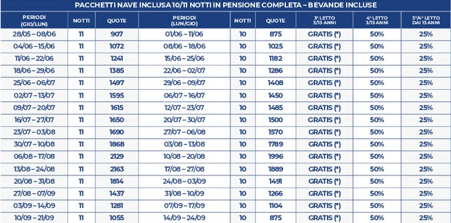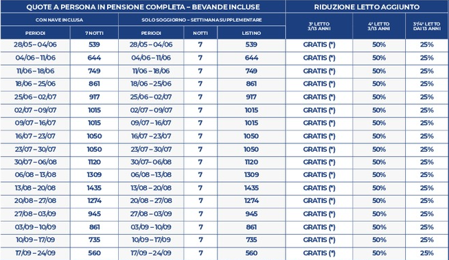 NON DISPONIBILI ALLE SUDDETTE TARIFFE partenze comprese dal 05/08/26 sera al 21/08/2026 sera (sarà comunque possibile prenotarle con una quotazione ad hoc).