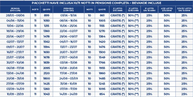 NON DISPONIBILI ALLE SUDDETTE TARIFFE partenze comprese dal 05/08/26 sera al 21/08/2026 sera (sarà comunque possibile prenotarle con una quotazione ad hoc).