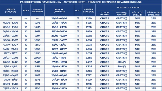 Quota individuale* Pacchetti con Nave + auto o in solo soggiorno 10/11 notti PENSIONE COMPLETA (bevande incluse)