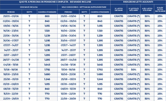 NON DISPONIBILI ALLE SUDDETTE TARIFFE partenze comprese dal 05/08/26 sera al 21/08/2026 sera (sarà comunque possibile prenotarle con una quotazione ad hoc).