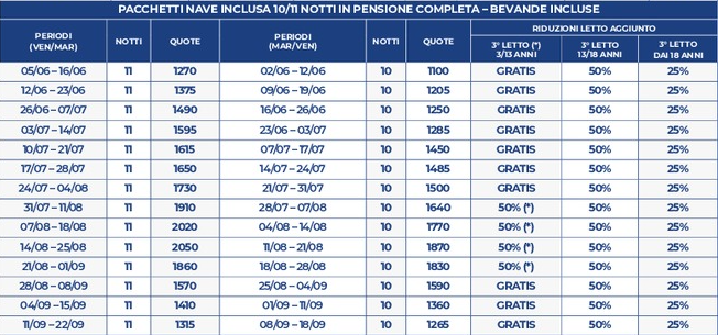 LA QUOTA CON NAVE INCLUDE: soggiorno + nave nottuna a/r (sistemazione passaggio ponte) con auto al seguito di lunghezza max 5 metri e altezza max 1.90 NO camper, furgoni, jeep, minibus. Con un minimo di 2 quote intere paganti, con la seguente compagnia marittima: