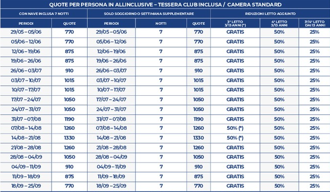 Le tariffe non comprendono eventuali promozioni da verificare al momento della prenotazione. Le tariffe riportate potrebbero non comprendere polizze assicurative integrative, adeguamento carburante (ove i trasferimenti fossero inclusi), eventuali tessere iscrizione, tasse, pulizie, consumi, ecc.; in tal senso è possibile richiedere accesso a listino dettagliato via mail, scrivendo a: numerouno@aldiladeisogniviaggi.it