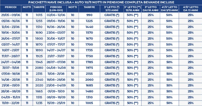 Quota individuale* PACCHETTI CON NAVE + AUTO O IN SOLO SOGGIORNO - 10/11 NOTTI IN PENSIONE COMPLETA - BEVANDE INCLUSE