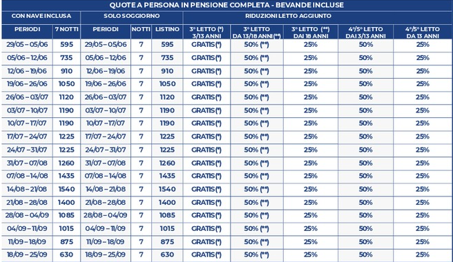 NON DISPONIBILI ALLE SUDDETTE TARIFFE partenze comprese dal 05/08/26 sera al 21/08/2026 sera (sarà comunque possibile prenotarle con una quotazione ad hoc).