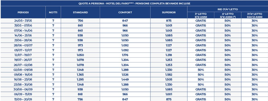 RIDUZIONI IN CAMERE COMUNICANTI (MIN/MAX 4 PERSONE): 3°/4° letto dai 3 anni riduzione -25%.